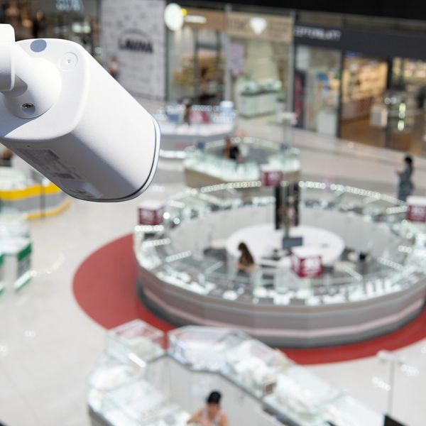 Cameras track movement in shopping areas to prevent theft and ensure safety.